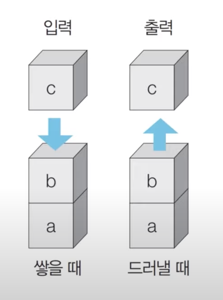 - 먼저 들어온 데이터가 마지막에 나가는 형식, 후입선출(Last In First Out)
