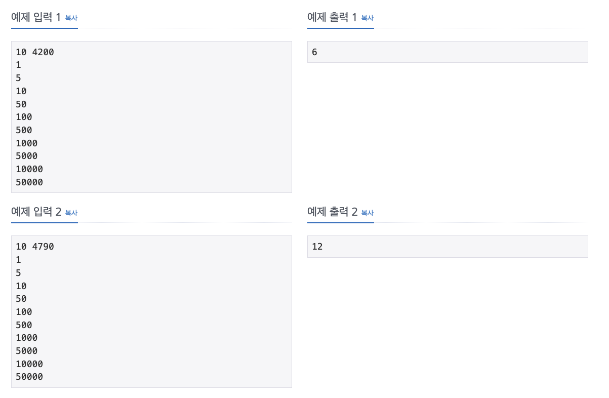 탐욕적 기법의 대표문제로 볼 수 있는 동전 문제이다. 예전에 풀었던 문제라 수월하게 풀었다. 가장 값이 비싼 동전부터 사용해서 전체 금액을 모두 차감하는 식으로 구성하면 된다.