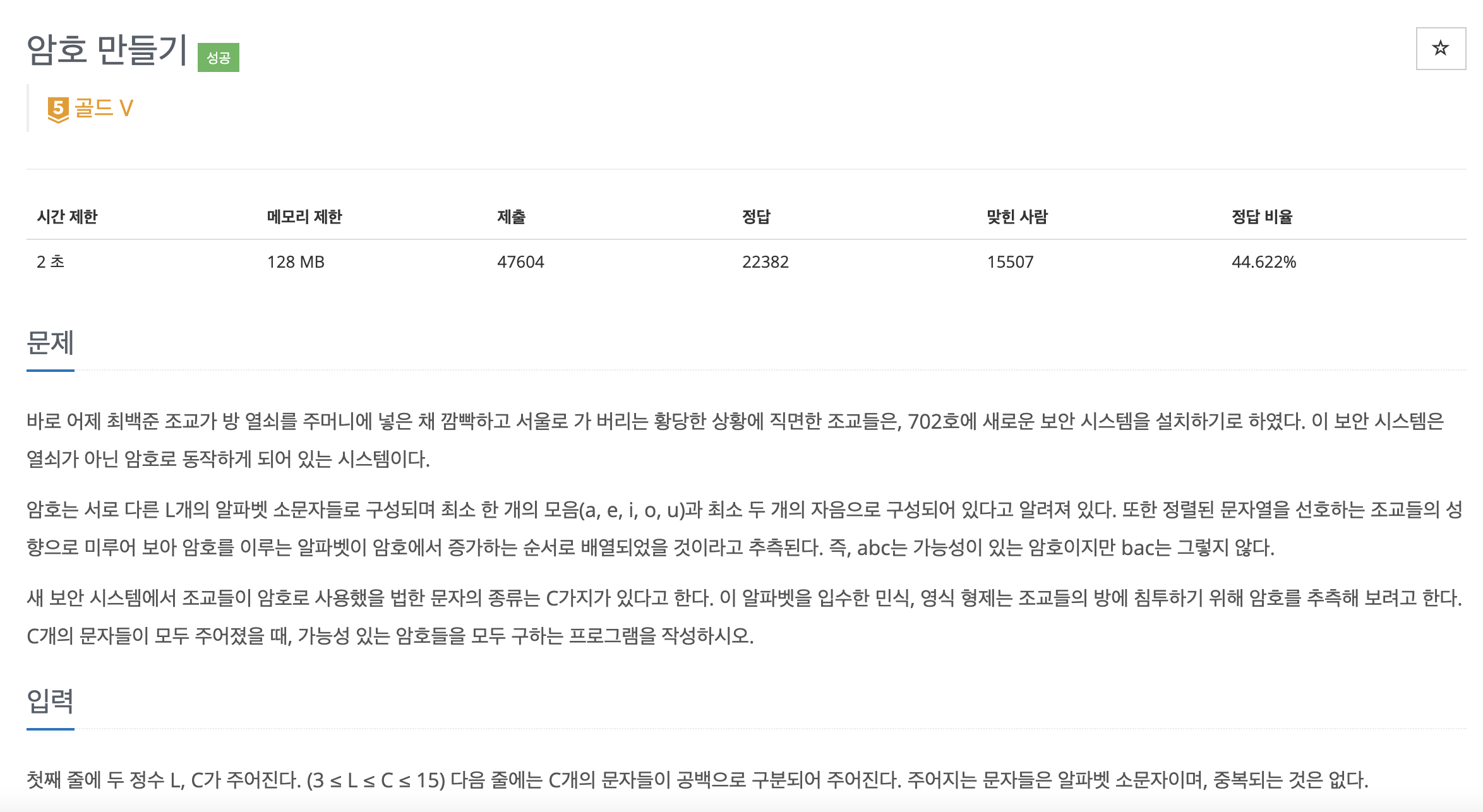 전형적인 백트래킹 문제 유형이다. l, c 값과 알파벳을 받아오고, vowel(모음) 5개를 리스트에 넣어준 뒤, findPassword라는 재귀 함수를 만들어주었다. 이 함수의 로직을 간단히 설명하겠다.