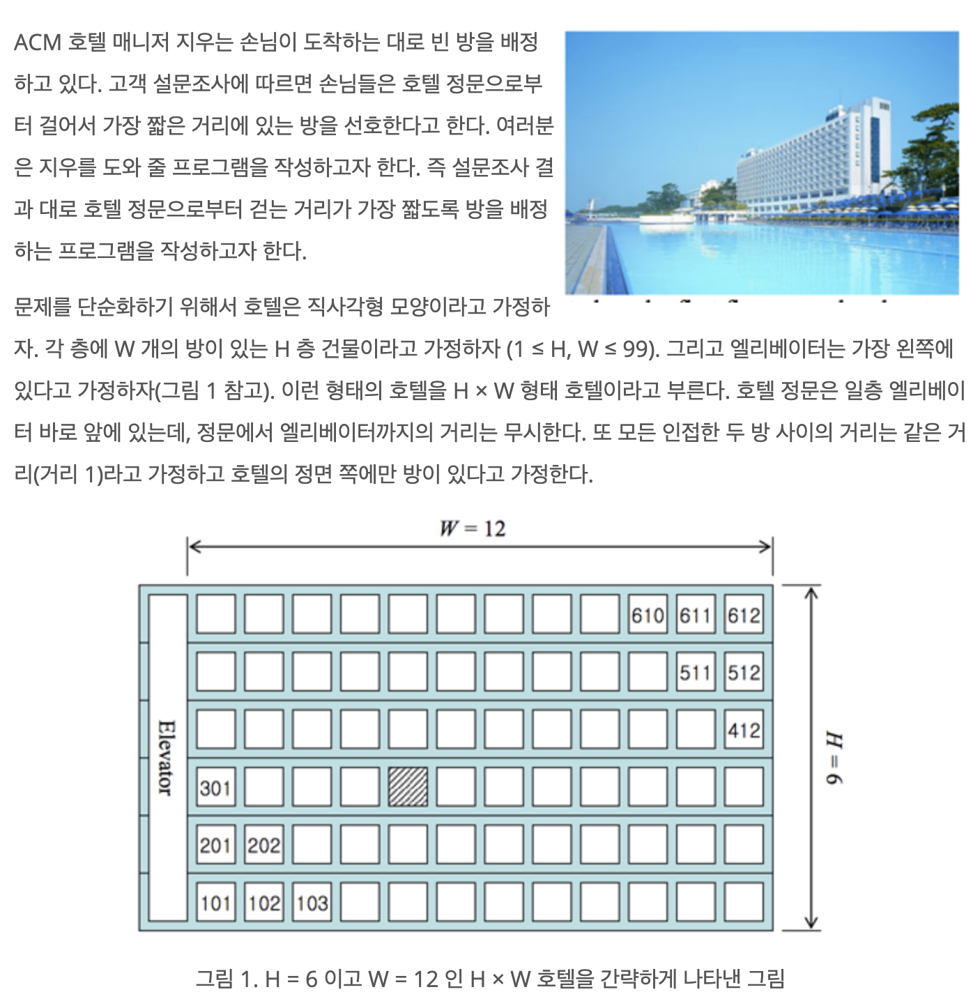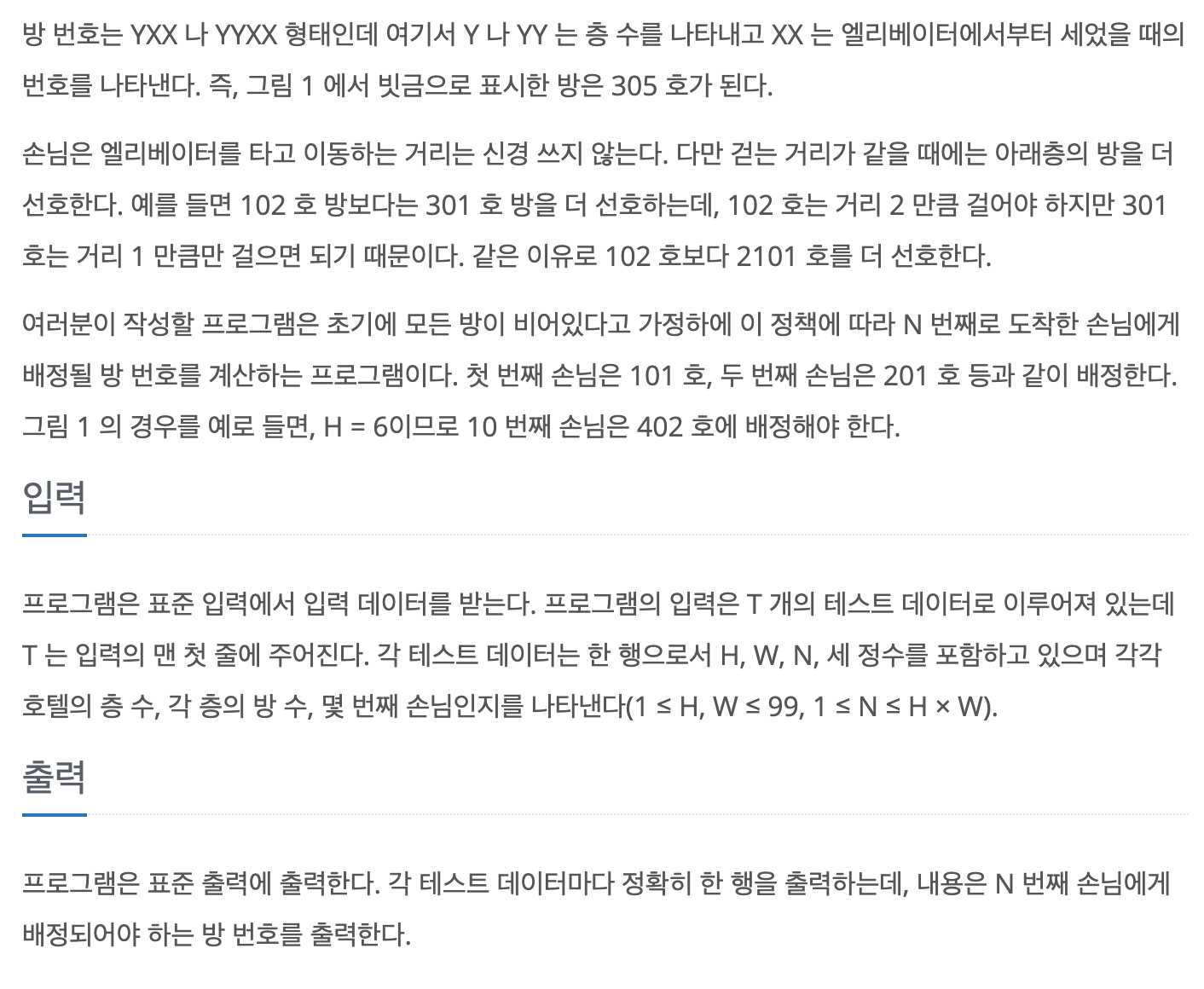 이 문제의 핵심은 경우의 수를 잘 나누는 것입니다. 호텔에 온 순서대로 1)가까운 호실, 2) 낮은 층을 배정합니다. 101, 201, 301..102, 202, 302.. 의 형태로 배정이 되겠죠. 먼저 여러 개의 테스트케이스를 받기 때문에 for문을 활용하여 H, W, N을 테스트케이스 배열에 저장합니다. 그 다음, N번째로 온 손님이 머물 층과 호수를 따로 구해야 합니다. 먼저 층은 N을 H로 나눈 나머지가 될 것입니다. 단, 나머지가 0이라면 N은 H가 되어야 합니다. 호실의 경우 N을 H로 나눈 몫이 됩니다. 이제 하나의 문자열에 층과 호수를 합쳐서 방 번호를 출력하면 되는데, 호수가 9 이하라면 층과 호수 사이에 0을 삽입해야 합니다.